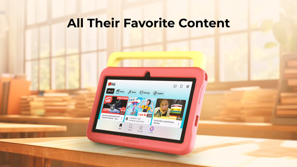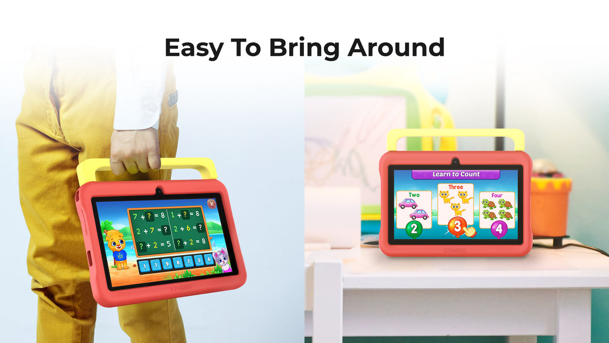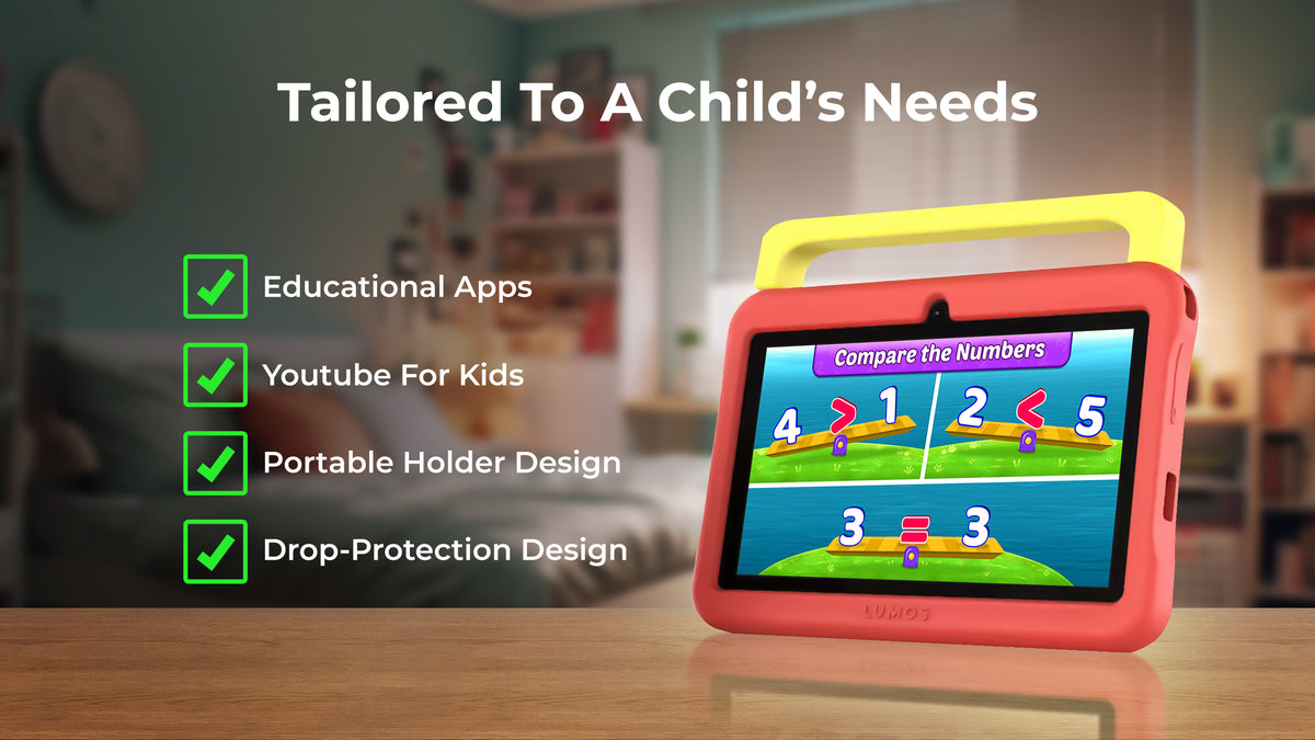 LUMOS KIDS Tablet is an all-in-one educational & leisure tablet made specially for your kid. With apps that promote learning in language, math, puzzle games coupled with entertainment like Youtube Kids, this is the perfect device for them. Comes with parental lock, and a drop-protection design too!