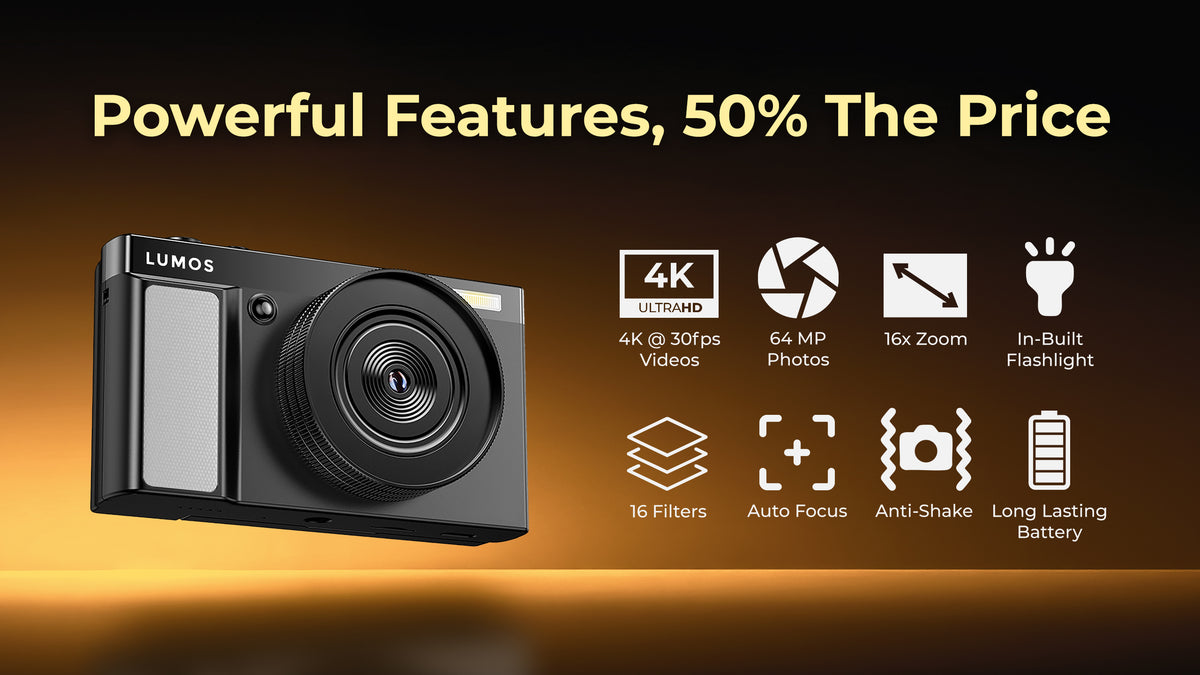 LUMOS EVOKE blends modern tech with a vintage charm. Capture 64MP photos, record in 4K videos - all in a soft vintage style. With 16 inbuilt filters, auto focus & anti-shake, 16x zoom, built-in flashlight and a long battery life, it’s perfect for everyday memories, travel, and everything in between — all for just $149.